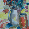 An electric acrylic painting from Wayne Webster, featuring bursts of colorful flowers set in a pitcher next to an empty cup awaiting its set of vibrant flowers. The composition if blues, pinks, purples and reds spill across the table setting in rich hues creating a intricate scene. This piece is perfect for enhancing your living or working spaces.
